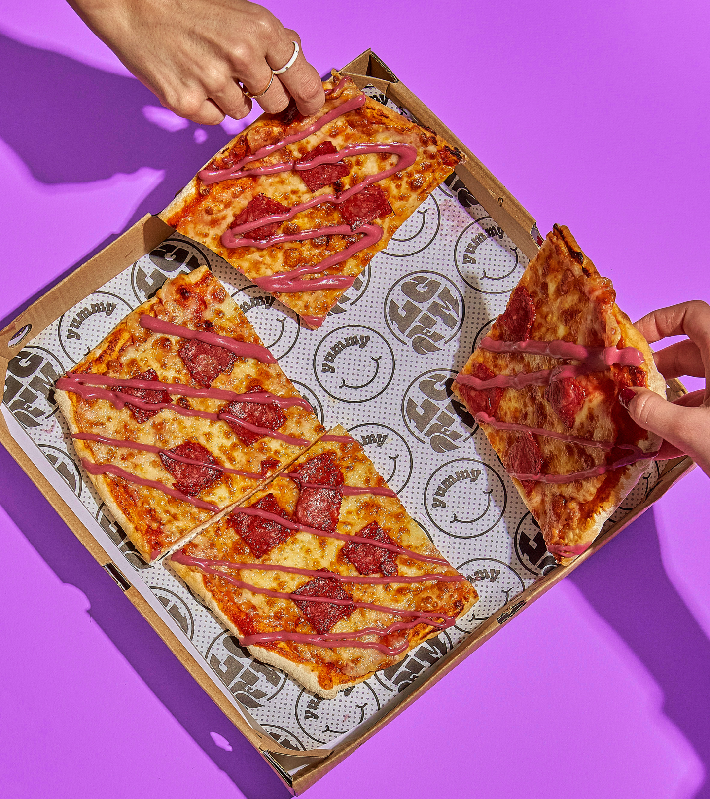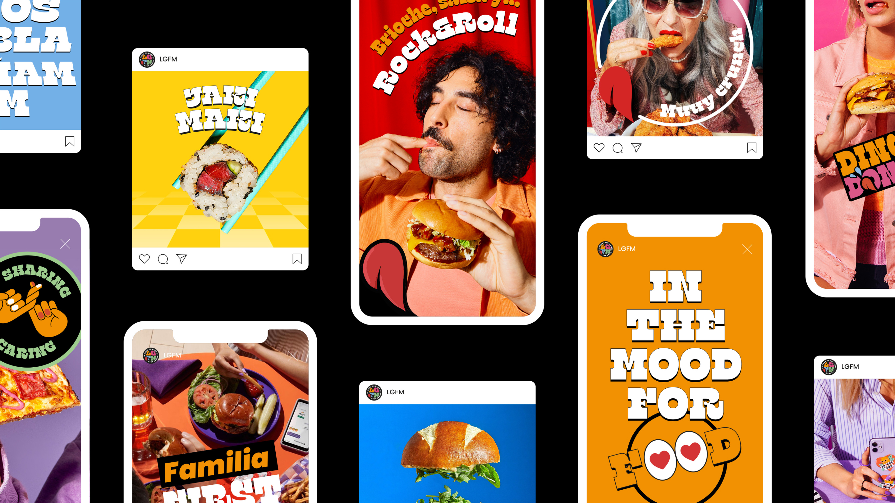 Brand identity and creative direction for the food delivery chain La Gran Familia Mediterránea. The brand features a dynamic family of characters, each with their own personality, representing different types of food. Our work included developing the branding, packaging, app, and fulfilling every kind of graphic design request.